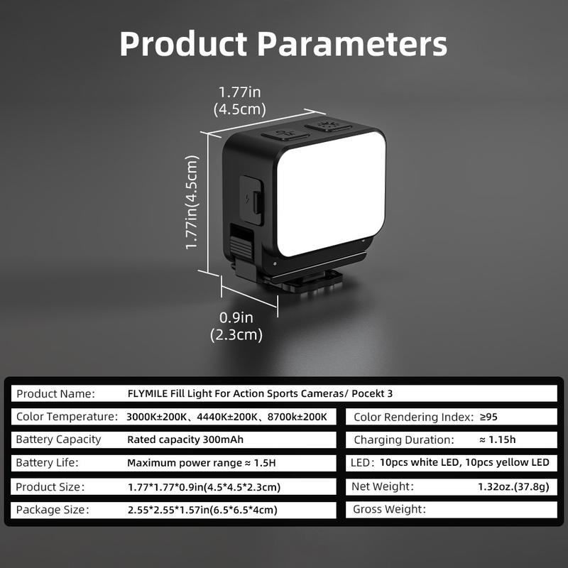 Verbeter uw video's en foto's met de FLYMILE-actiecamera-invullicht, ontworpen om vlogs, nachtopnames en close-ups een heldere, flatterende belichting te geven. De compacte lamp klikt snel vast dankzij sterke ingebouwde magneten en de IPX4-spatwaterdichte behuizing maakt hem tot een betrouwbare metgezel voor buitenopnames. Met drie kleurtemperatuuropties en meerdere verlichtingsmodi kun je snel aanpassen aan de omgeving en je beelden er scherp, natuurlijk en professioneel uit laten zien.