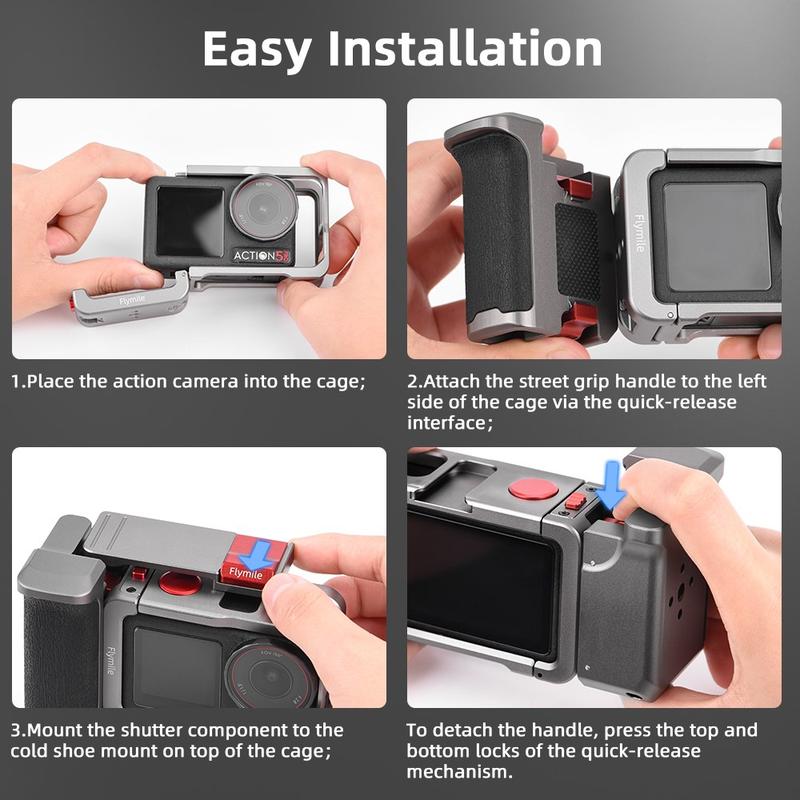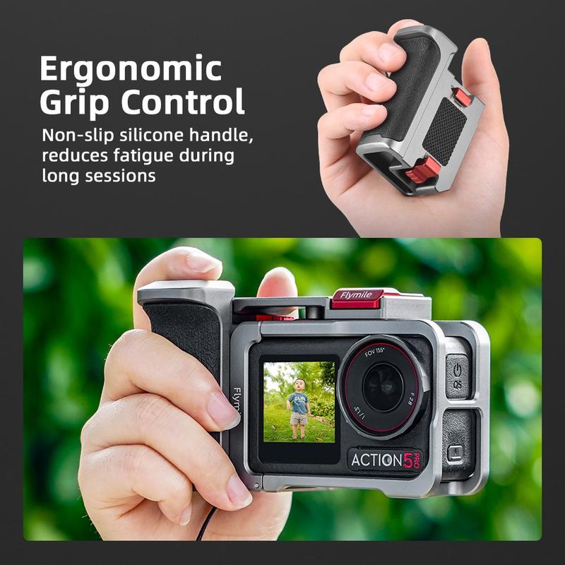 Flymile Actiecamera handgreep en kooiset voor DJI Osmo Action 5 Pro/4/3 - Sluiterknopgreep met cold shoe en polsband