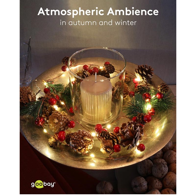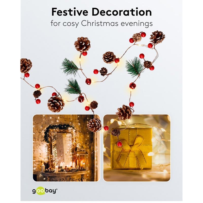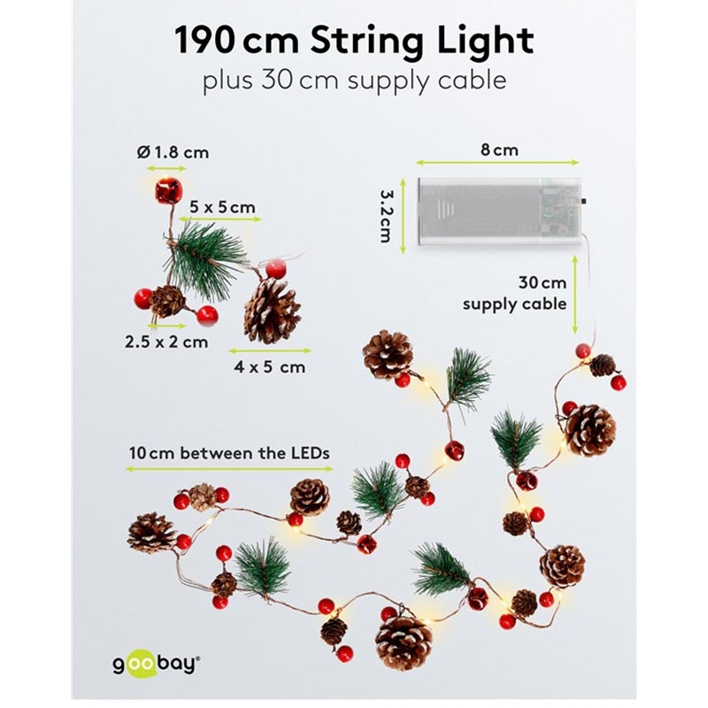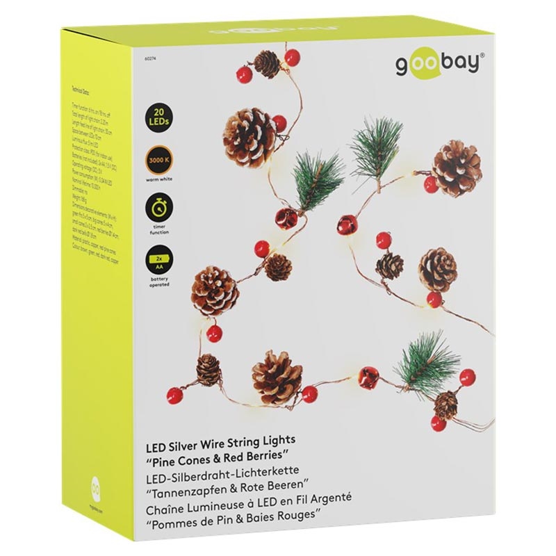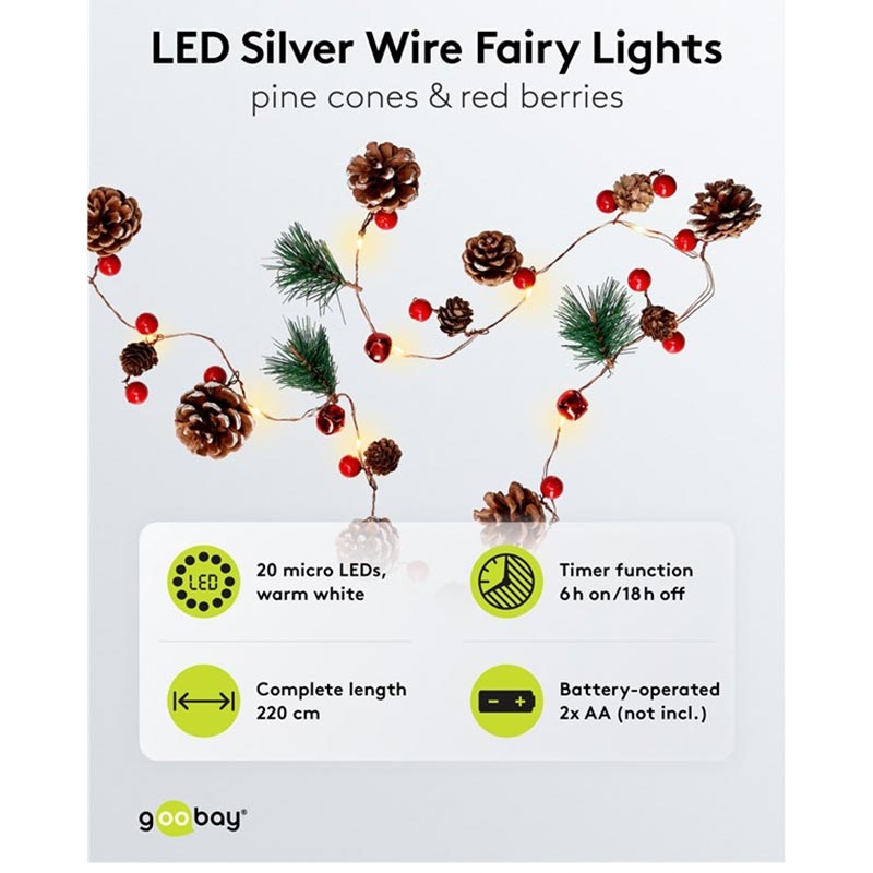 20-LED Zilverdraad Sprookjesverlichting "Dennenappels & Rode Bessen" met Timer, Warm Wit 3000 K, Batterijgevoed (Binnen, IP20)
