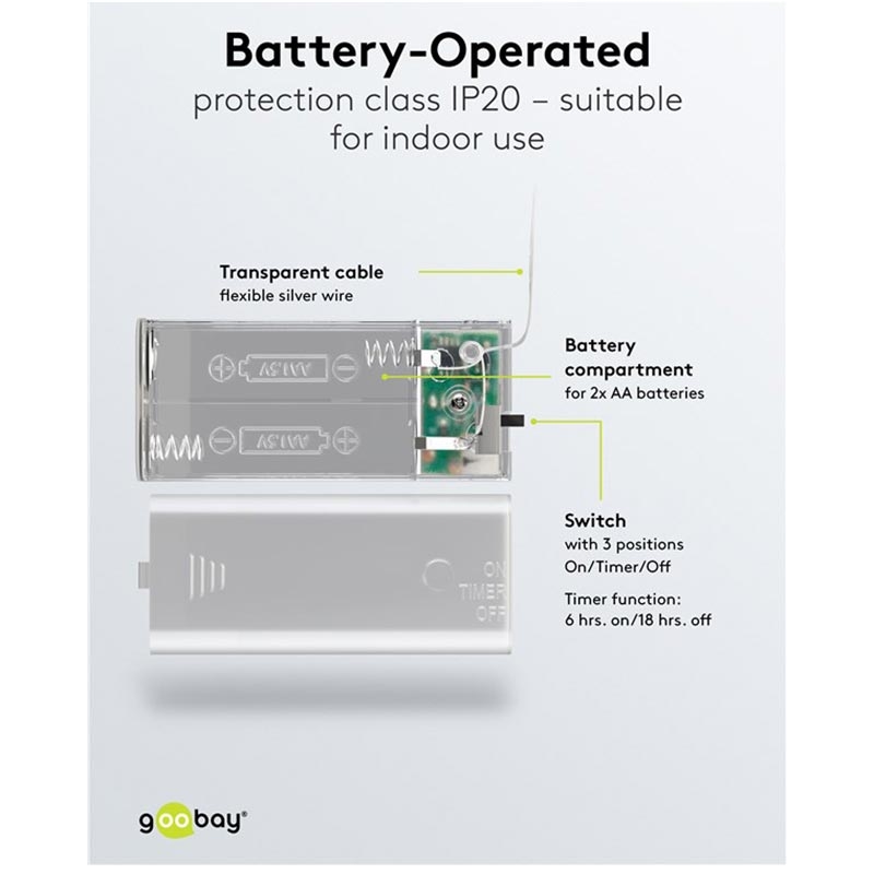 - Werkt op batterijen (2× AA, niet meegeleverd) voor plaatsing overal binnenshuis