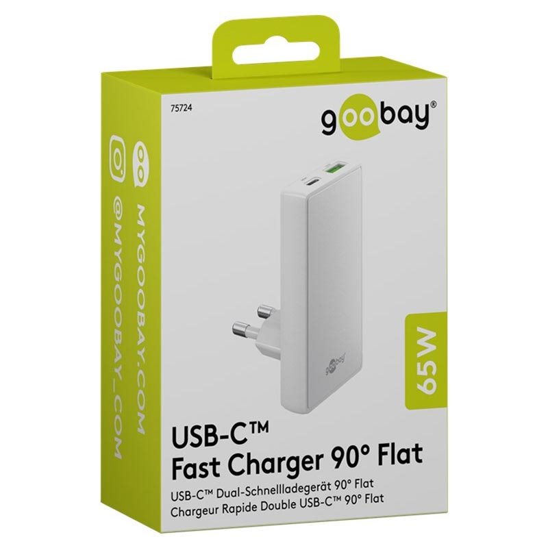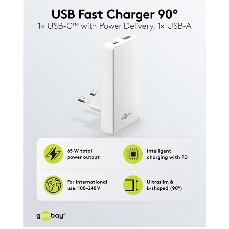 Goobay GaN Dual Snelle Lader 90° Plat 65W - Ultradunne Muurlader met USB-C & USB-A Poorten