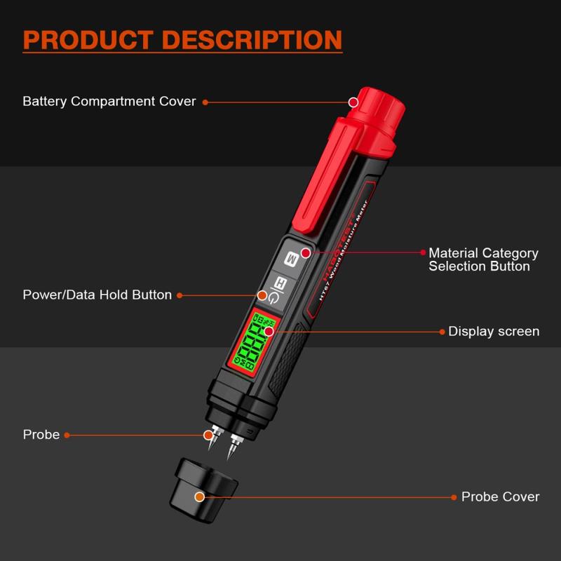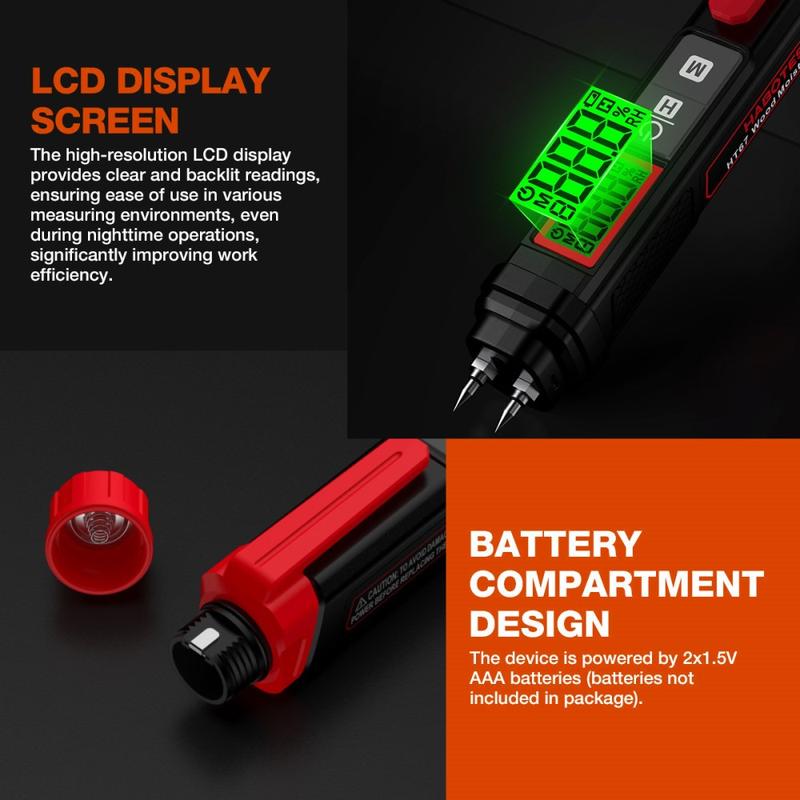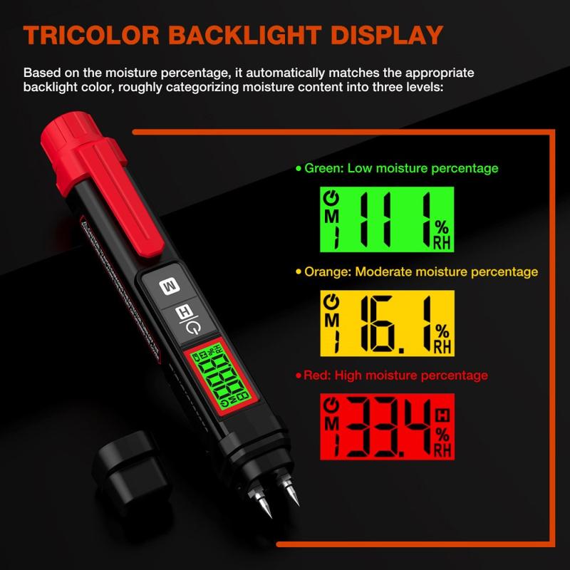 Dankzij de penvormige behuizing is het apparaat gemakkelijk mee te nemen en ter plaatse te gebruiken, terwijl de roestvrijstalen sondes zijn ontworpen voor regelmatig testen op verschillende oppervlakken. Een LCD-display met driekleurige achtergrondverlichting maakt de resultaten bovendien gemakkelijker af te lezen en geeft de vochtigheidsomstandigheden in één oogopslag duidelijker weer, zelfs in donkere omgevingen.
