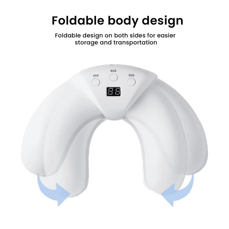Creëer thuis nette, salonachtige resultaten met deze halvemaanvormige, opvouwbare mininagellamp die ontworpen is voor zowel vingernagels als teennagels. Het compacte, ruimtebesparende ontwerp kan worden ingeklapt voor eenvoudig opbergen en reizen, terwijl de verstelbare opening helpt om comfortabel te passen op verschillende handgroottes. Het gerichte uithardingsgebied is gemaakt om nagellak uit te harden zonder de achterkant van de hand onnodig bloot te leggen. Met 22 LED's (18 blauwe + 4 rode) en een duidelijk LCD-scherm kun je je sessie in één oogopslag volgen en kun je kiezen uit drie timerinstellingen voor een gecontroleerde, consistente nagelverzorging. Dankzij de USB-voeding (DC 5V) kun je hem bijna overal gebruiken: aan je bureau, op de bank of op reis.