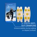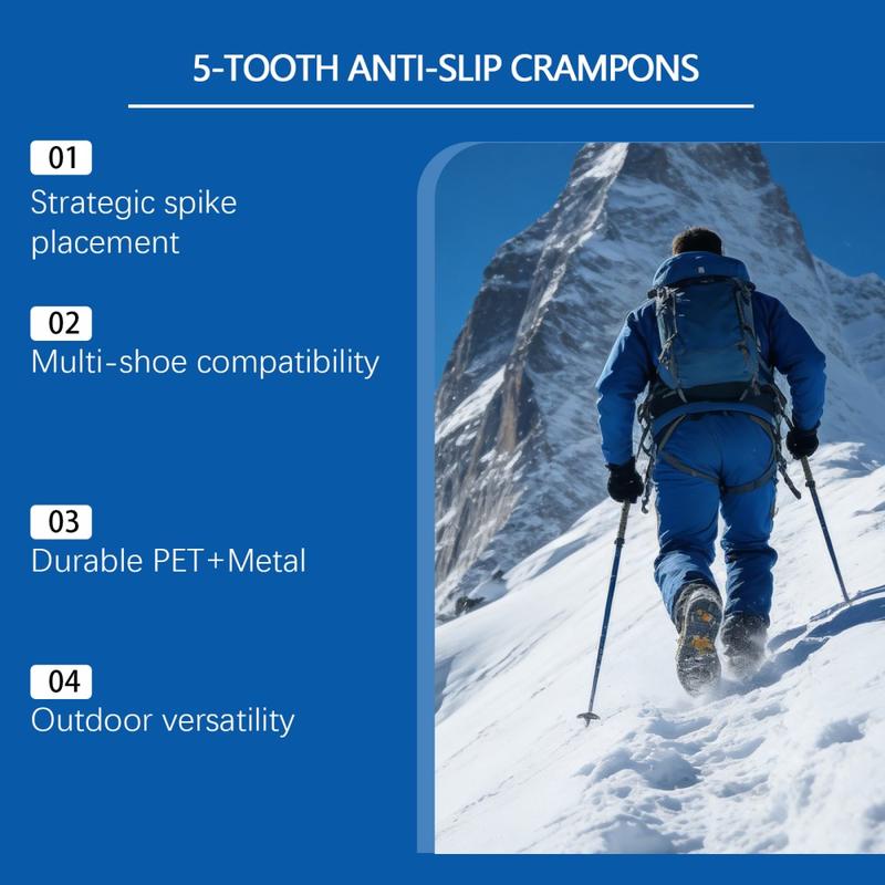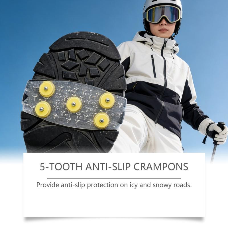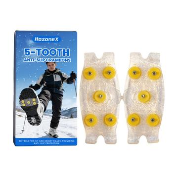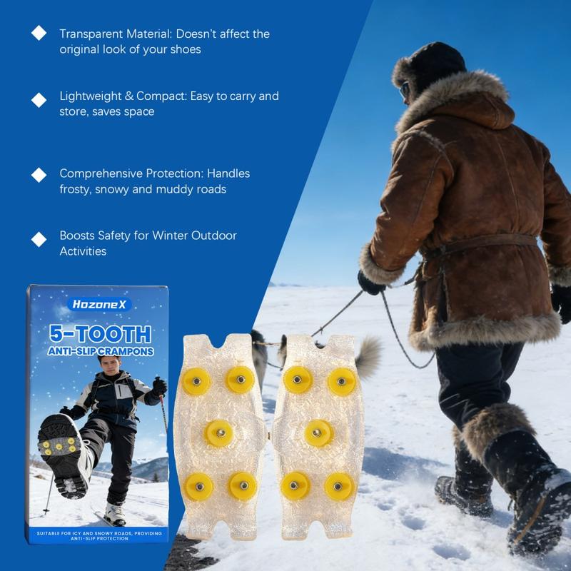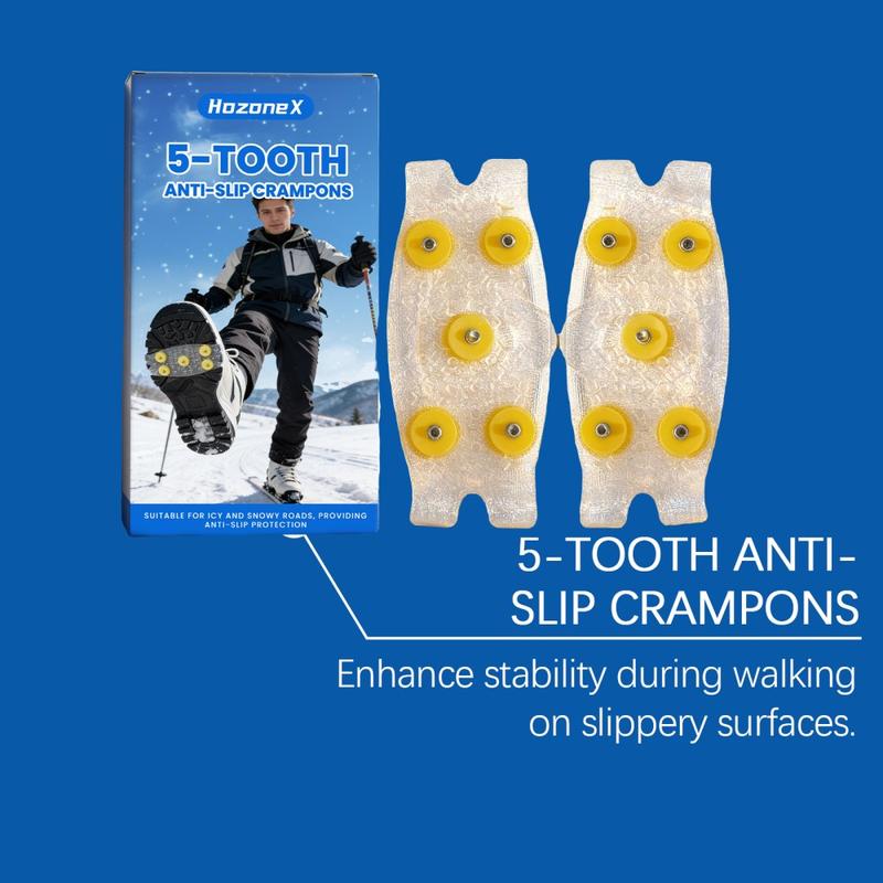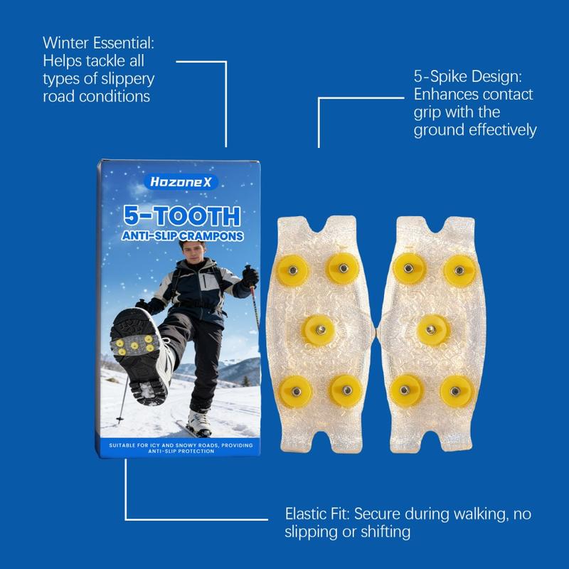 Loop met meer zelfvertrouwen over ijzige paden en besneeuwde straten met HOZONEX 5-tands ijskrammen. Deze krammen zijn ontworpen om de grip op gladde oppervlakken te verbeteren. Elke kram heeft 5 strategisch geplaatste metalen spikes om het contact met de grond te vergroten en uitglijden te helpen voorkomen wanneer het glad is. De flexibele TPE-basis past over vele soorten schoenen en zorgt voor een stevige pasvorm die stabiel blijft tijdens het lopen zonder te verschuiven.