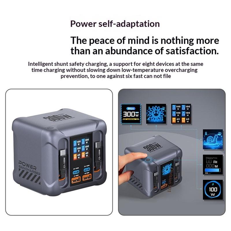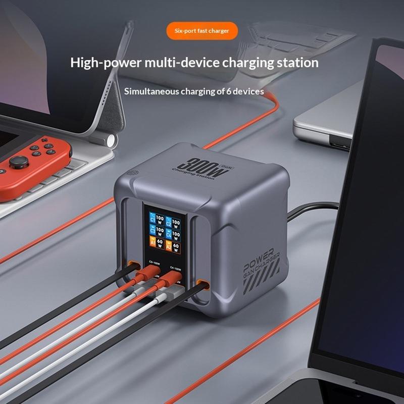 HW866 300W GaN-oplaadstation voor op het bureau met LCD-scherm - 6-poorts oplader met 2 intrekbare USB-C-kabels, EU-stekker