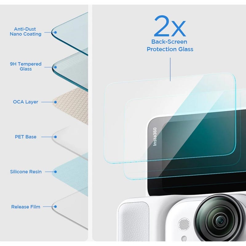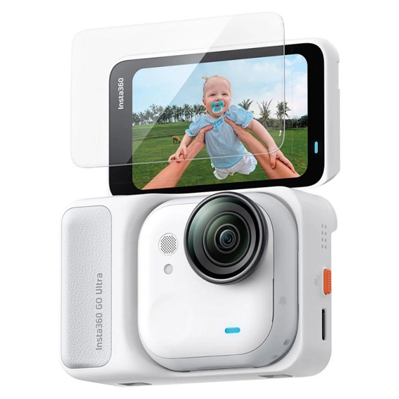 Het 0.3 mm dikke geharde glas heeft de industriestandaard 9H-hardheid, dus het is bestand tegen krassen door sleutels, munten en andere voorwerpen in je tas of broekzak. Bovendien zorgen het oleofobe oppervlak en de gladde 2.5D-randen voor eenvoudig onderhoud en comfort wanneer je je Insta360 Go Ultra vasthoudt.