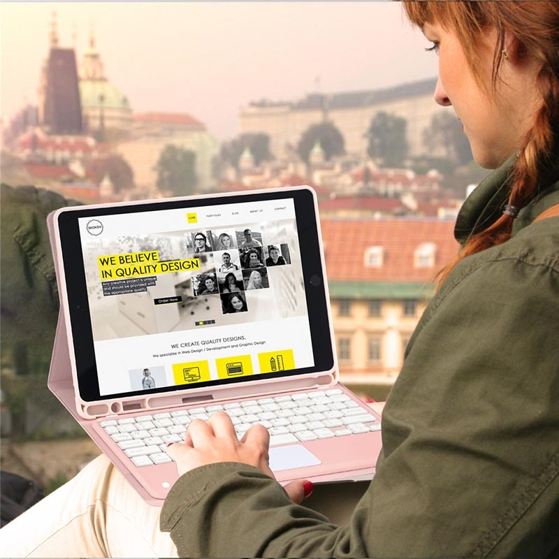 Verfraai je iPad Air 11 2026/2025/2024, iPad Air 2022/2020 met de Bluetooth toetsenbordhoes, een multifunctioneel 2-in-1 accessoire dat bescherming, productiviteit en stijl combineert. Deze slanke hoes is gemaakt van eersteklas polyurethaan en biedt volledige bescherming tegen krassen, schokken en vingerafdrukken met behoud van een professionele uitstraling. Het Bluetooth-toetsenbord maakt draadloos verbinding voor vloeiend, responsief typen, terwijl het geïntegreerde touchpad multi-gesture controle ondersteunt voor moeiteloze navigatie. Dankzij het toetsenbord met achtergrondverlichting kunt u zelfs in omgevingen met weinig licht comfortabel typen. De ingebouwde verstelbare standaard biedt een ergonomische kijkhoek, waardoor het perfect is voor typen, streamen of lezen. Deze toetsenbordhoes is ontworpen voor zakelijk, reis- of dagelijks gebruik en verandert je tablet in een draagbaar werkstation.