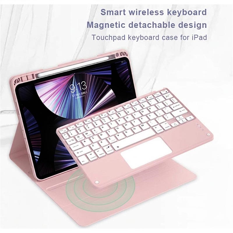 Verfraai je iPad Air 13 2026/2025/2024, iPad Pro 12.9 2022/2021/2020/2018 met de Bluetooth toetsenbordhoes, een multifunctioneel 2-in-1 accessoire dat bescherming, productiviteit en stijl combineert. Deze slanke hoes is gemaakt van eersteklas polyurethaan en biedt volledige bescherming tegen krassen, schokken en vingerafdrukken met behoud van een professionele uitstraling. Het Bluetooth-toetsenbord maakt draadloos verbinding voor vloeiend, responsief typen, terwijl het geïntegreerde touchpad multi-gesture controle ondersteunt voor moeiteloze navigatie. Dankzij het toetsenbord met achtergrondverlichting kunt u zelfs in omgevingen met weinig licht comfortabel typen. De ingebouwde verstelbare standaard biedt een ergonomische kijkhoek, waardoor het perfect is voor typen, streamen of lezen. Deze toetsenbordhoes is ontworpen voor zakelijk, reis- of dagelijks gebruik en verandert je tablet in een draagbaar werkstation.