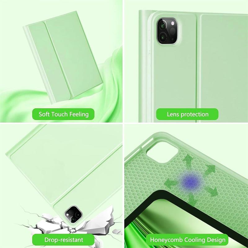 Verfraai je iPad Air 13 2026/2025/2024, iPad Pro 12.9 2022/2021/2020/2018 met de Bluetooth toetsenbordhoes, een multifunctioneel 2-in-1 accessoire dat bescherming, productiviteit en stijl combineert. Deze slanke hoes is gemaakt van eersteklas polyurethaan en biedt volledige bescherming tegen krassen, schokken en vingerafdrukken met behoud van een professionele uitstraling. Het Bluetooth-toetsenbord maakt draadloos verbinding voor vloeiend, responsief typen, terwijl het geïntegreerde touchpad multi-gesture controle ondersteunt voor moeiteloze navigatie. Dankzij het toetsenbord met achtergrondverlichting kunt u zelfs in omgevingen met weinig licht comfortabel typen. De ingebouwde verstelbare standaard biedt een ergonomische kijkhoek, waardoor het perfect is voor typen, streamen of lezen. Deze toetsenbordhoes is ontworpen voor zakelijk, reis- of dagelijks gebruik en verandert je tablet in een draagbaar werkstation.