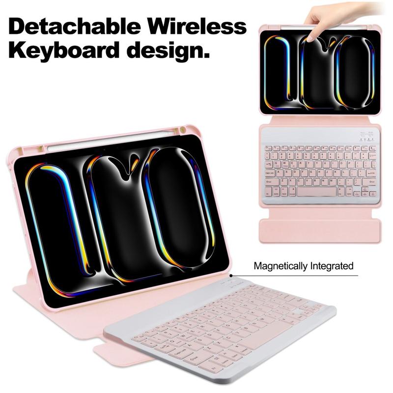 Ervaar verhoogd gemak en bescherming voor uw iPad Pro 11 2024/2025. Deze veelzijdige hoes heeft een 360 graden draaibare standaard en biedt zowel liggende als staande weergaveopties voor moeiteloos multitasken. Hij is gemaakt van een mix van PU-leer en acryl en biedt duurzame kras- en stootbestendigheid met behoud van een slanke, moderne look. Het geïntegreerde toetsenbord verbetert de productiviteit onderweg, waardoor het een topkeuze is voor studenten, professionals en alledaagse gebruikers.