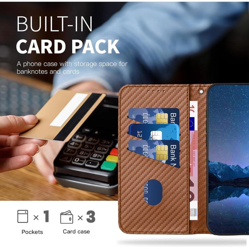 Deze wallet case biedt een elegant ontwerp, betrouwbare bescherming en slimme bruikbaarheid. De getextureerde koolstofvezel afwerking voegt een moderne, professionele look toe, terwijl de TPU binnenlaag schokken absorbeert bij het per ongeluk laten vallen. Met handsfree functionaliteit en een afneembare riem is hij gemaakt voor comfort en veelzijdigheid.
