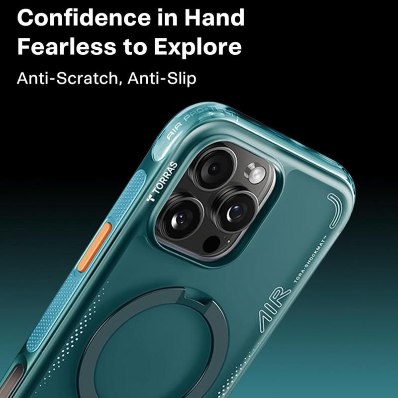 De Torras Ostand Q3 Air MagSafe Case voor iPhone 16 Pro combineert moderne esthetiek met geavanceerde bescherming. Hij is gemaakt van hoogwaardige TPU- en PC-materialen en biedt een slank, stijlvol profiel met een veilige en comfortabele grip.