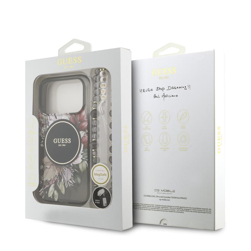 Guess IML Flowers hoesje met parelband voor iPhone 17 Pro - MagSafe-compatibel Elegant beschermhoesje met kralen polsbandje