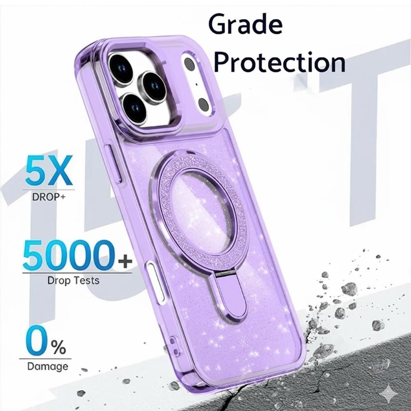Breng stijl en bescherming samen met de iPhone 17 Pro glittercase, die elegante schittering combineert met betrouwbare duurzaamheid voor elke dag. Gemaakt van hoogwaardige materialen en uitgerust met een ingebouwde kickstand met metalen ring, houdt deze hoes je telefoon de hele dag veilig, functioneel en modieus.
