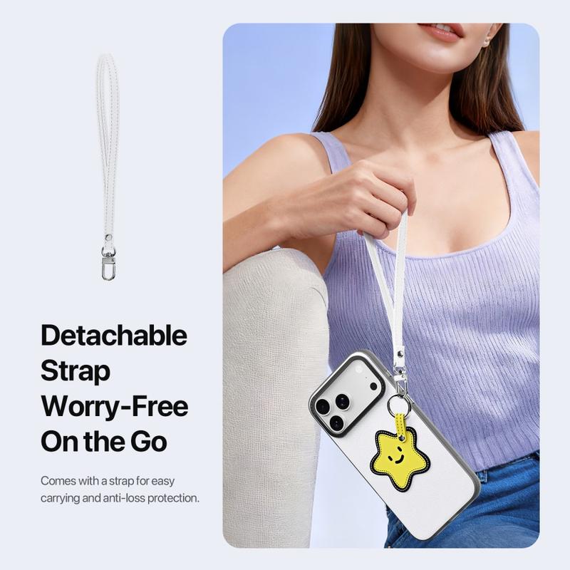 Er wordt een afneembare riem meegeleverd voor gemakkelijk dragen tijdens het reizen, woon-werkverkeer of dagelijkse activiteiten. Het biedt extra beveiliging tegen verlies en geeft je iPhone 17 Pro een modieus accessoire tintje.