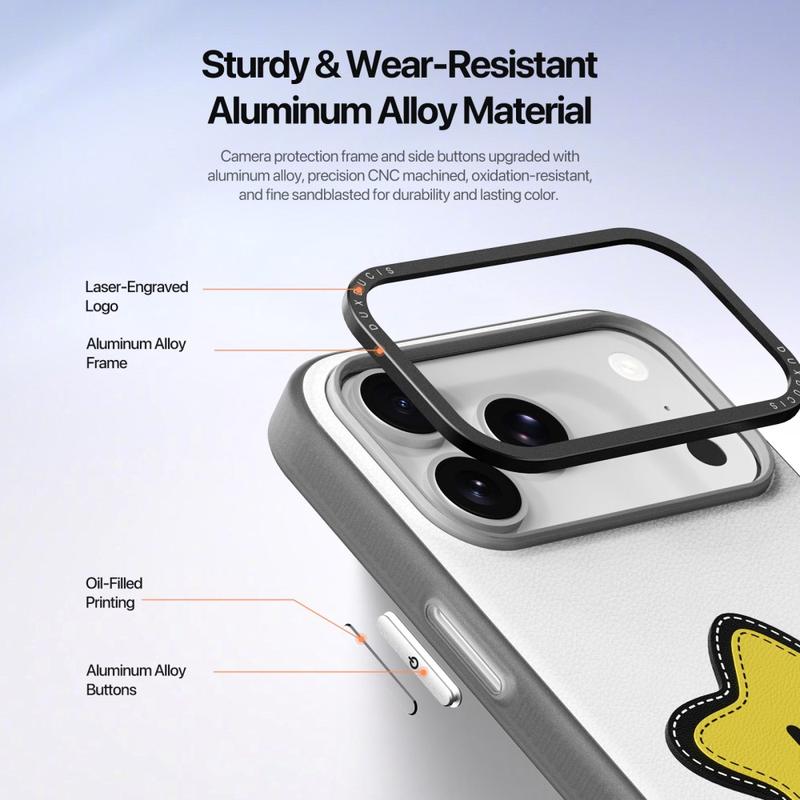 Het camerabeveiligingsframe en de zijknoppen zijn gemaakt van aluminiumlegering, nauwkeurig CNC-bewerkt en afgewerkt met fijn zandstralen. Dit zorgt voor langdurige kleur, duurzaamheid en een premium gevoel, versterkt met subtiele lasergegraveerde details.
