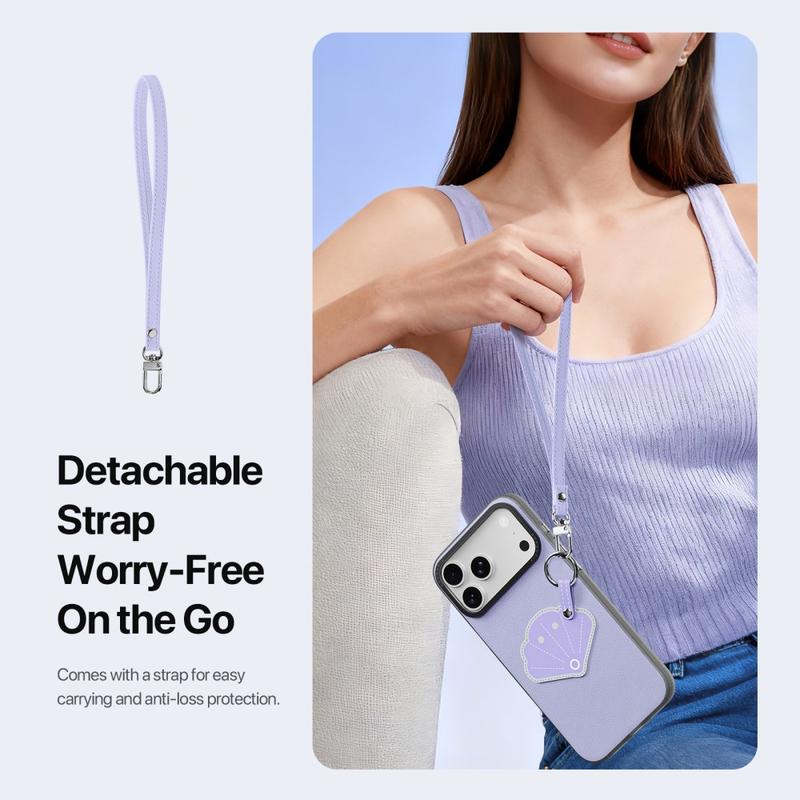 Er wordt een afneembare riem meegeleverd voor gemakkelijk dragen tijdens het reizen, woon-werkverkeer of dagelijkse activiteiten. Het biedt extra beveiliging tegen verlies en geeft je iPhone 17 Pro een modieus accessoire tintje.