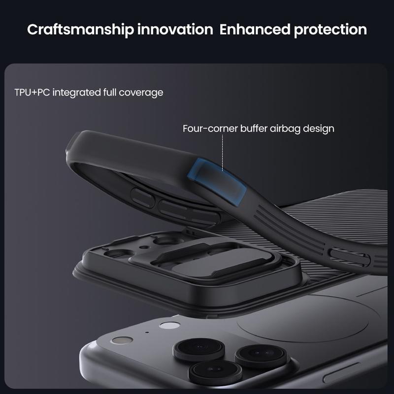 Geniet van extra privacy en bescherming met de Nillkin CamShield Pro hybride hoes. Door de combinatie van hard plastic en TPU voorkomt de camerahoes krassen en beschermt hij je iPhone 17 Pro Max tegen dagelijkse slijtage.