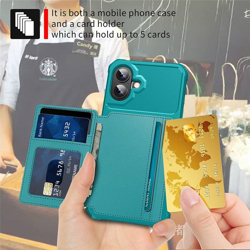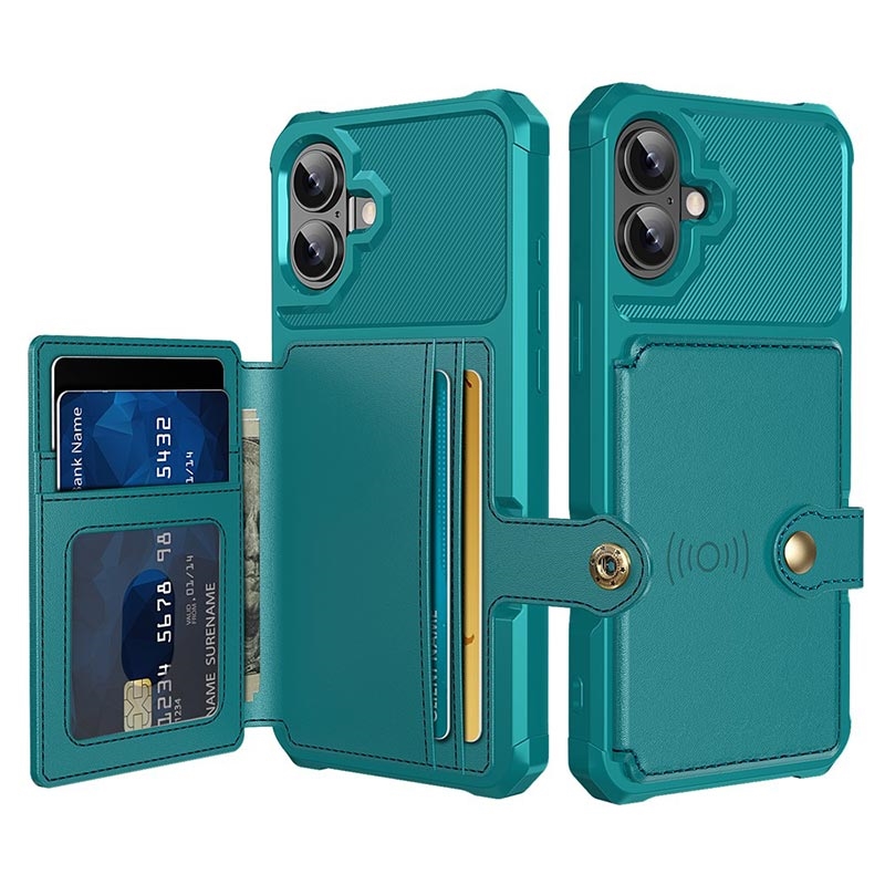 - iPhone 17 portemonnee-hoesje heeft een veilige drukknoopsluiting, portemonnee-ontwerp en verschillende kaartsleuven met geldvak