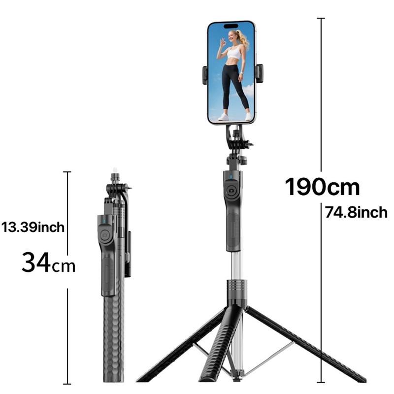 - Veelzijdig 2-in-1 ontwerp: Te gebruiken als selfie stick of statief, uitschuifbaar tot 190 cm voor groepsfoto's, vlogs en opnames boven je hoofd.
