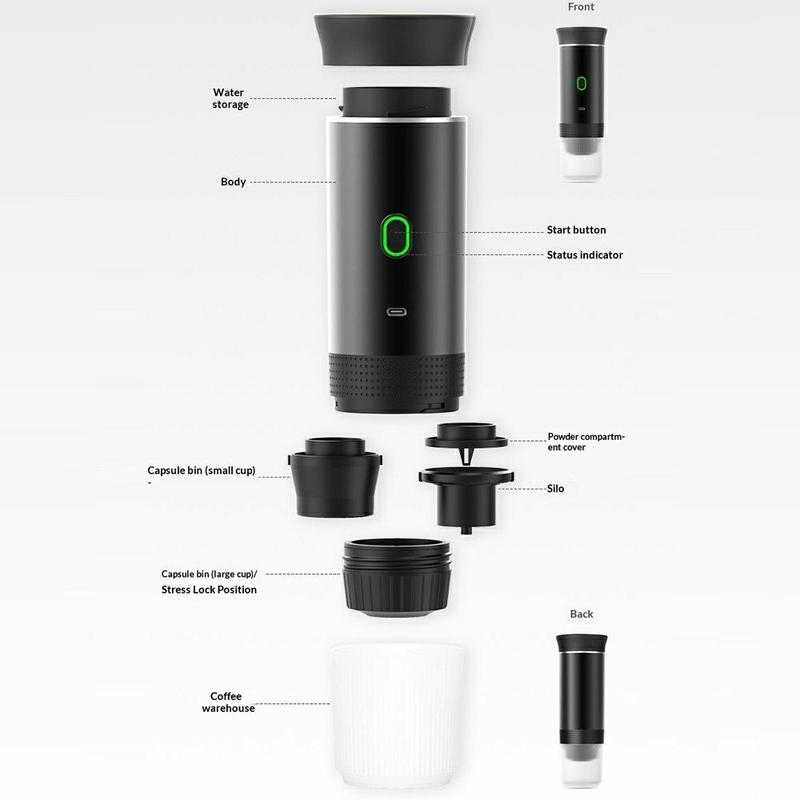 Met een druk van 20 bar zorgt het voor een rijke espresso-extractie, terwijl de ingebouwde oplaadbare batterij en bediening met één druk op de knop het praktisch maken voor gebruik buitenshuis. Dankzij het compacte formaat en het lichtgewicht ontwerp is het gemakkelijk mee te nemen in een tas, koffer of auto.
