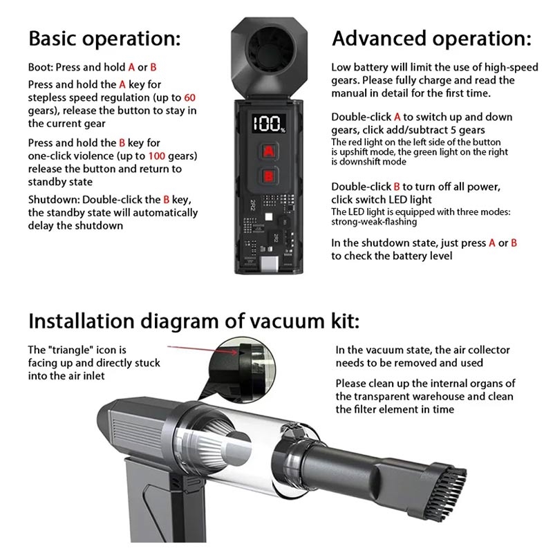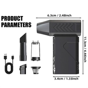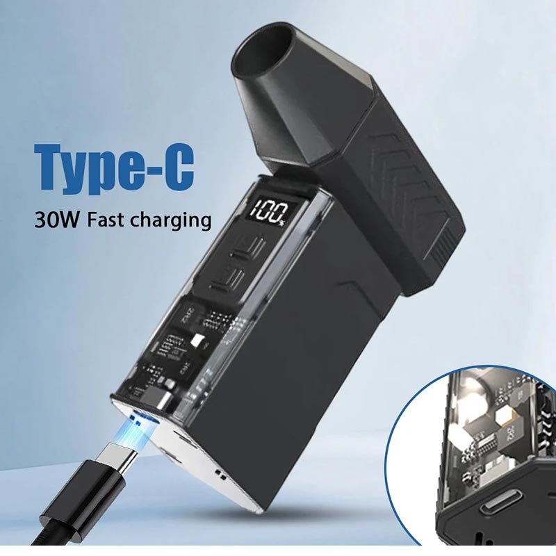 De 2-in-1 Jet Turbo Blower en Stofzuiger is een compact, snel reinigingsapparaat dat is ontworpen voor het snel verwijderen van stof en dagelijkse schoonmaakwerkzaamheden. Schakel tussen krachtige luchtstralen en vacuümzuiging om verschillende taken in uw huis, auto of werkruimte uit te voeren. Met 100 snelheidsniveaus en een grote 8000 mAh-batterij kunt u de luchtstroom of zuigkracht nauwkeurig afstellen en indien nodig langdurig blijven werken.