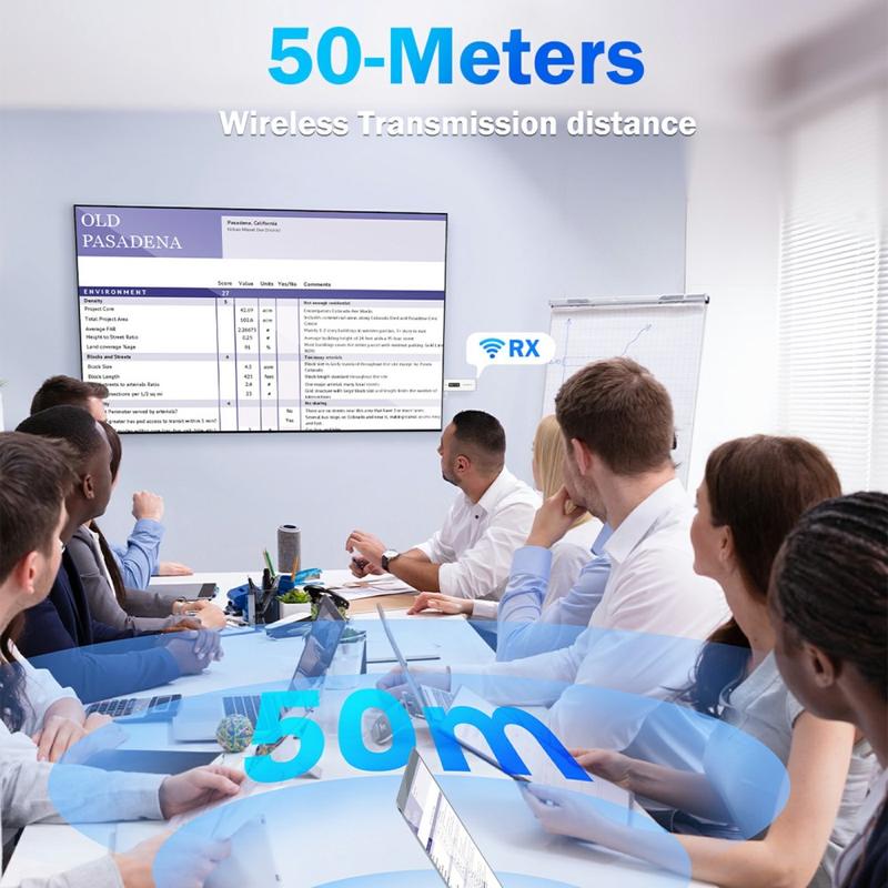 Het systeem ondersteunt videotransmissie tot 1080P, wat zorgt voor een scherpe beeldkwaliteit en betrouwbare prestaties voor schermen, projectoren en monitors. Het is ideaal voor professionele presentaties, afspelen van video en scherm spiegelen.