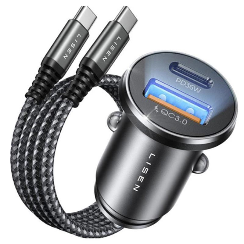 Lisen 51W-autolader met USB-C-kabel - 1 x USB-C en 1 x USB-A, Power Delivery, Quick Charge, PPS, aluminiumlegering
