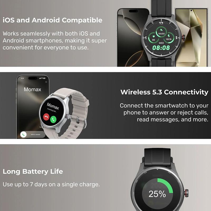 Houd uw dag onder controle met de MOMAX 1-Wear Smart Watch, een sportieve, stijlvolle smartwatch die is gemaakt voor het bijhouden van uw dagelijkse gezondheid en actieve routines. Het apparaat meet uw hartslag, SpO2 (bloedzuurstofgehalte) en stress, biedt AI-aangedreven slaapanalyse (inclusief diepe slaap en REM) en houdt uw trainingen bij met meer dan 100 sportmodi. Het ronde TFT-touchscreen van 1,38 inch is helder, gemakkelijk te bedienen en aanpasbaar met meerdere wijzerplaten, zodat het er op het werk net zo goed uitziet als tijdens het trainen. Met IP68-waterbestendigheid, Wireless 5.3-connectiviteit en een batterijduur tot 7 dagen is het ontworpen voor gemak van 's ochtends tot 's avonds.
