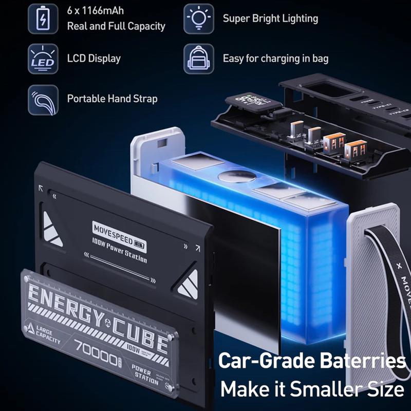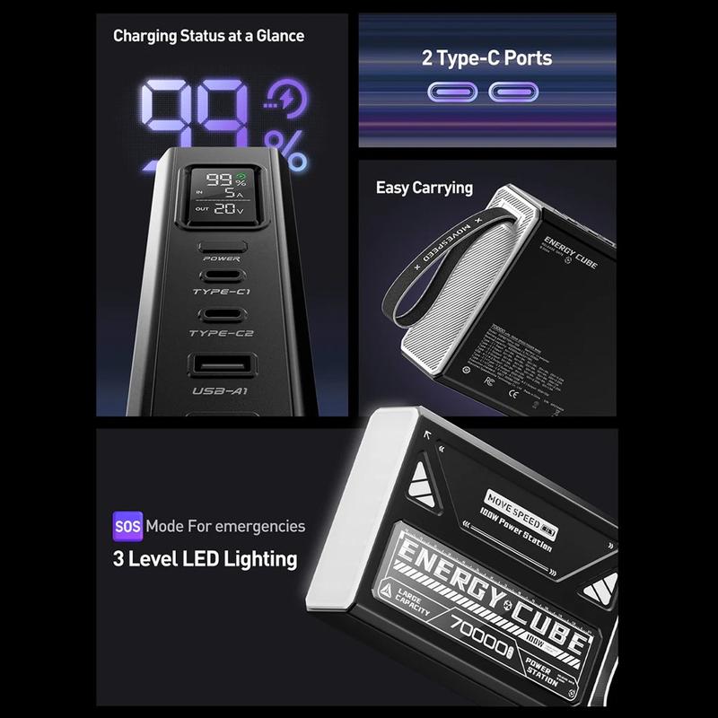 Houd al je apparaten dagenlang van stroom voorzien met de MOVESPEED YSPBZ70Pro-100 Power Bank, ontworpen voor serieuze capaciteit en prestaties. Met een enorme 70000mAh batterij, 100 W PD snel opladen, en een robuust, draagbaar ontwerp, is het perfect voor reizen, werken buitenshuis, en noodstroom back-up.