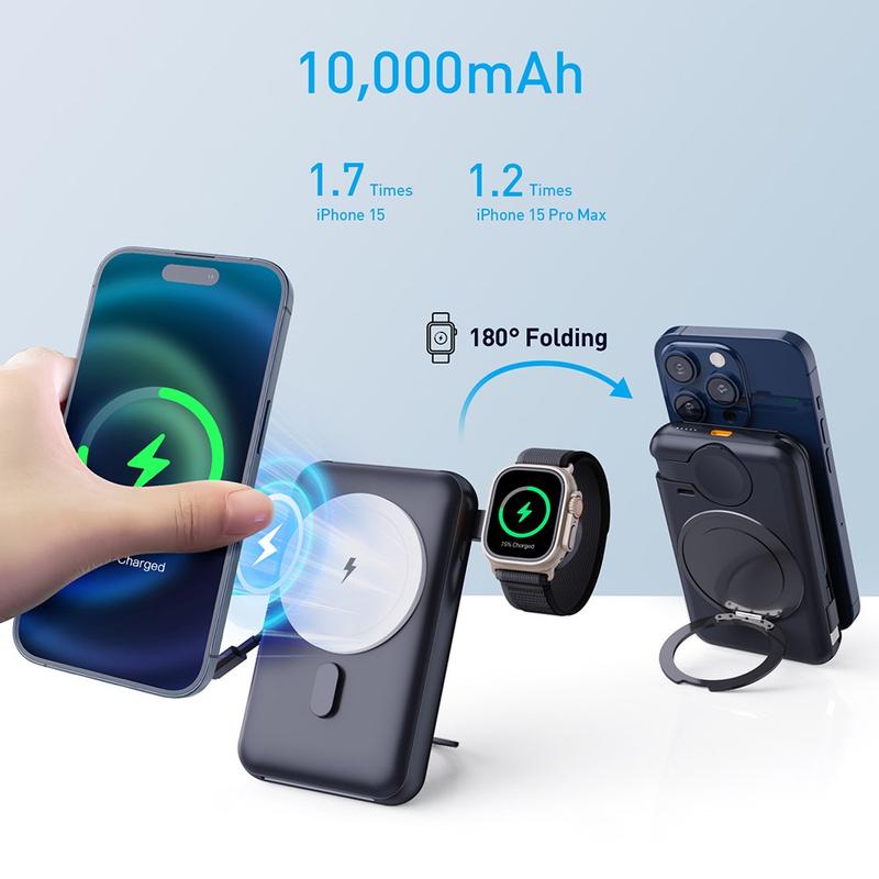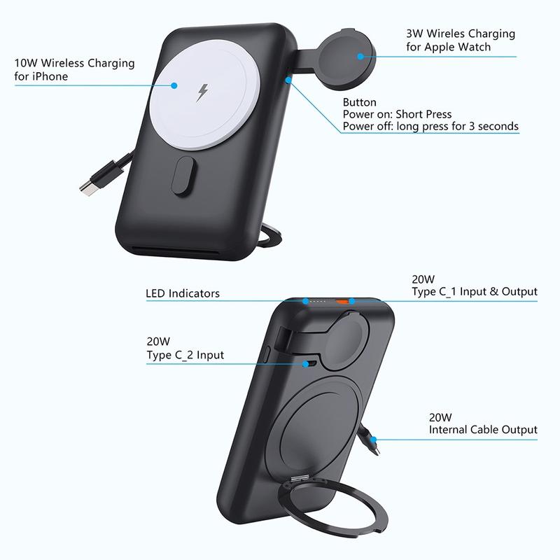 • MP07 10000mAh 3-in-1 magnetische powerbank - compatibel met MagSafe, draadloze oplader met ingebouwde kabel en draaibare standaard voor iPhone, AirPods en Apple Watch