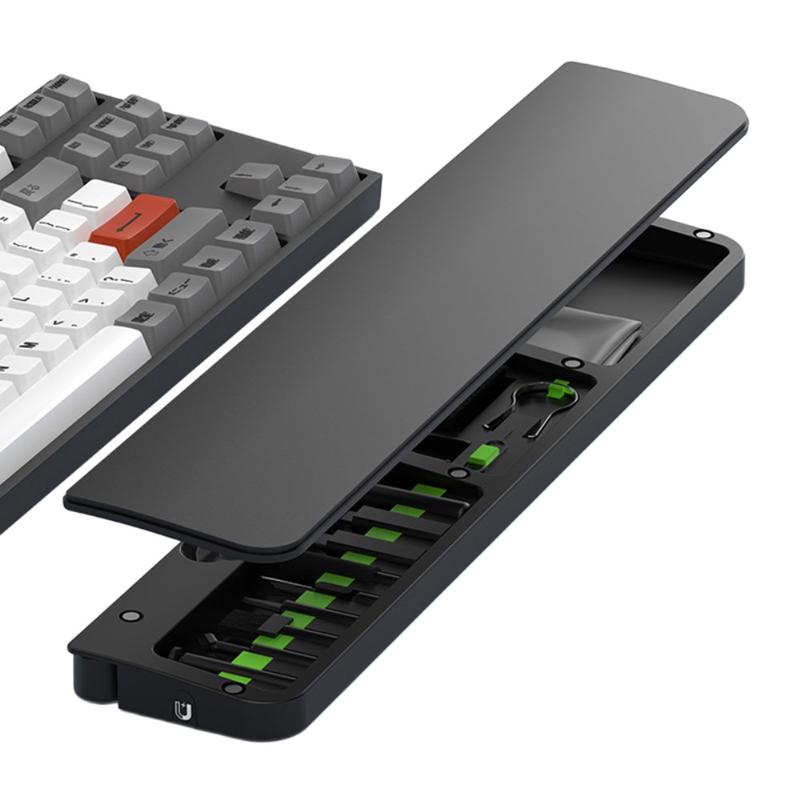 Binnenin de polssteun zit een complete reinigingsset met 22 gereedschappen, ontworpen voor een grondige reiniging van toetsenborden, oortelefoons, oplaadpoorten van telefoons, cameralenzen, schakelaars en andere elektronische apparaten. Elk gereedschap heeft zijn eigen plek, zodat je het gemakkelijk kunt organiseren en er snel bij kunt.