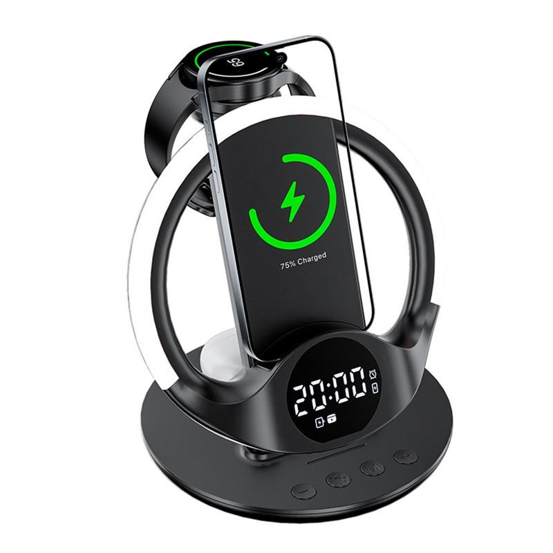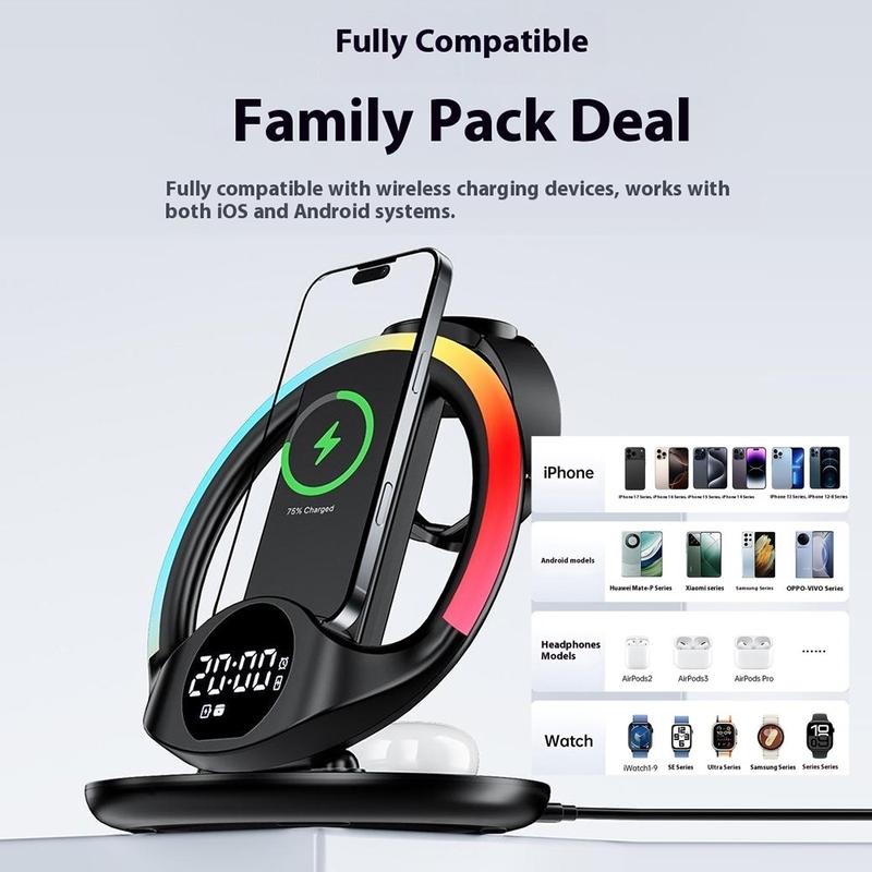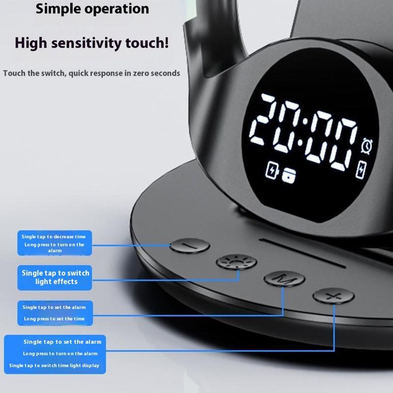N01 6-in-1 draadloos oplaadstation / magnetische snellaadstandaard met wekker, slimme temperatuurregeling en nachtlampje