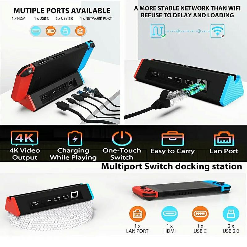 Upgrade je gaming-setup met het Nintendo Switch 2 dockingstation, ontworpen voor verbluffende beelden en veelzijdige connectiviteit. Met ondersteuning voor maximaal 4K bij 120Hz zorgt dit dock voor vloeiende high-definition gameplay op compatibele schermen. Met ingebouwde HDMI 2.1, USB 3.0, Type-C en RJ45-poorten biedt het een complete hub-oplossing voor gamen, streamen en snelle online verbindingen. Het compacte en draagbare ontwerp maakt het perfect voor zowel thuis als onderweg en levert de ultieme mix van prestaties en gemak.