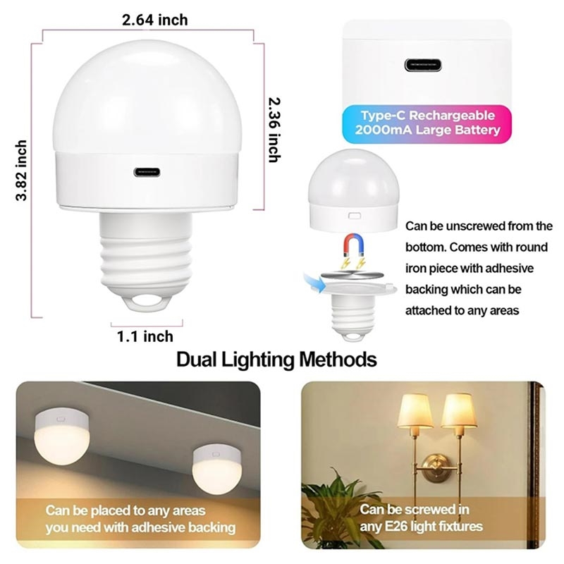 Verlicht je ruimte met de veelzijdige E27 oplaadbare gloeilampen. Met een ingebouwde 1800mAh batterij met hoge capaciteit zijn deze lampen perfect voor ruimtes zonder bedrading of stopcontacten. Dankzij de magnetische voet kun je de lamp eenvoudig opladen, terwijl je met de afstandsbediening de helderheid, warmte en kleur kunt aanpassen. Deze lampen zijn ideaal voor binnen en buiten en geven tot 15 uur continu licht.