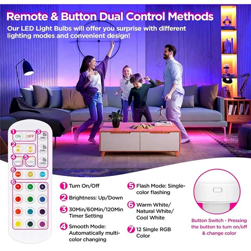 Oplaadbare gloeilamp met RGB en afstandsbediening - E27 - 2 stuks.