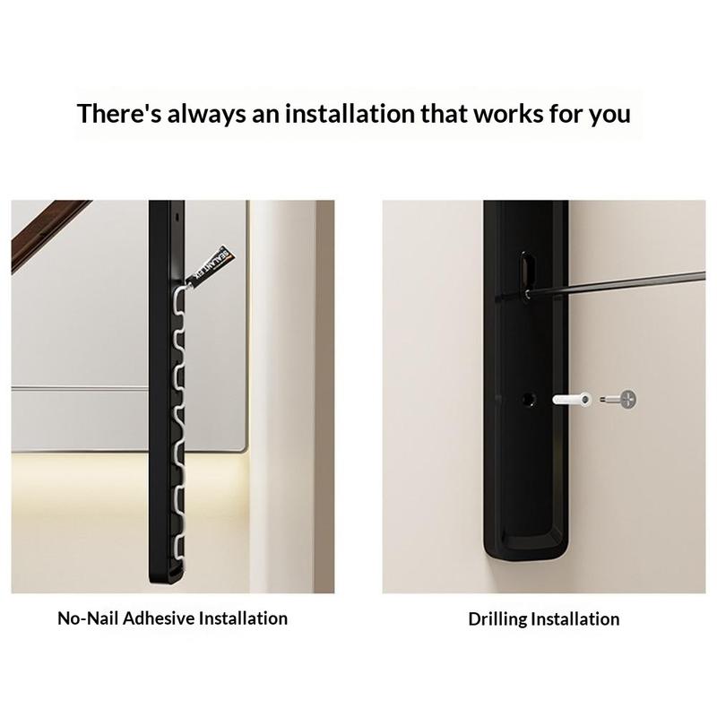 Het rek is gemaakt van duurzaam aluminium met versterkte stangen en biedt stabiele ondersteuning voor de dagelijkse was. Het kan worden geïnstalleerd met behulp van sterke zelfklevende rug voor installatie zonder boren of met schroeven voor extra stabiliteit, waardoor het geschikt is voor verschillende soorten wandoppervlakken.