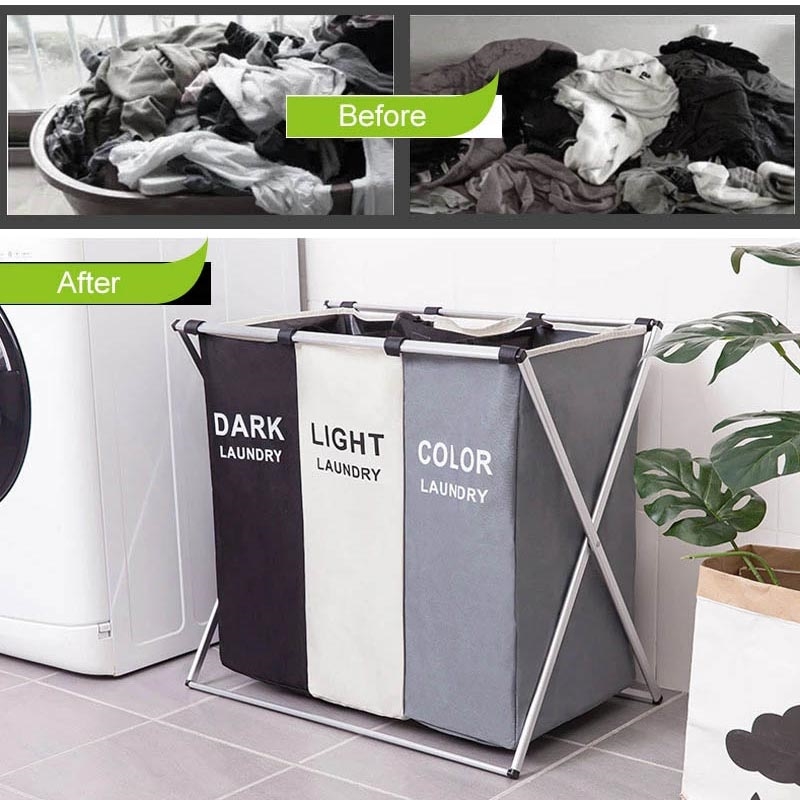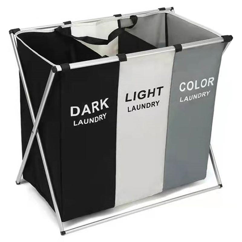 Deze opvouwbare wasmand met 3 cellen helpt je om kleding moeiteloos te organiseren en te scheiden. Met drie gelabelde compartimenten en een sterk aluminium frame houdt hij vuile was gesorteerd en netjes opgeborgen terwijl hij een schone en moderne look toevoegt aan je huis.