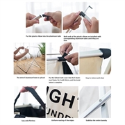 - Montage: Steek de ellebogen in de buizen → verbind het X-frame → bevestig de Oxford stoffen bekleding via riemen