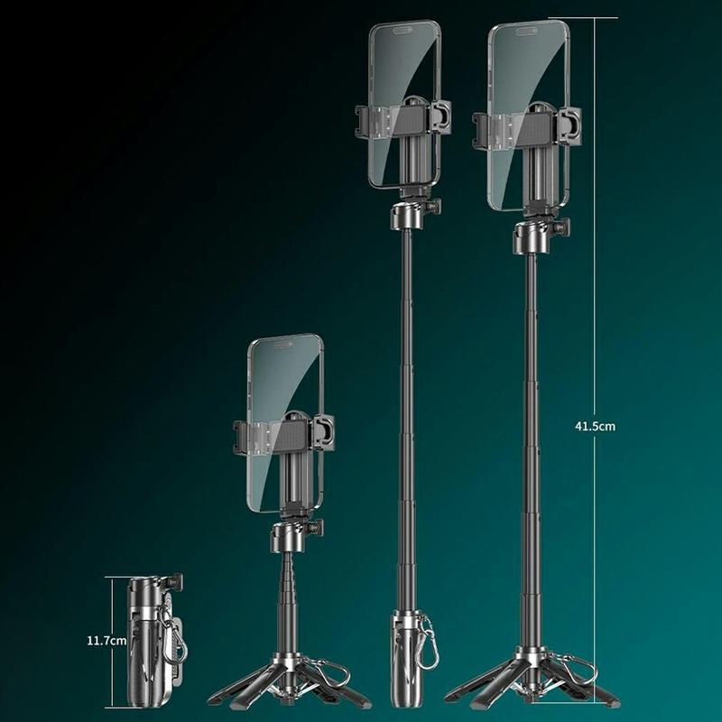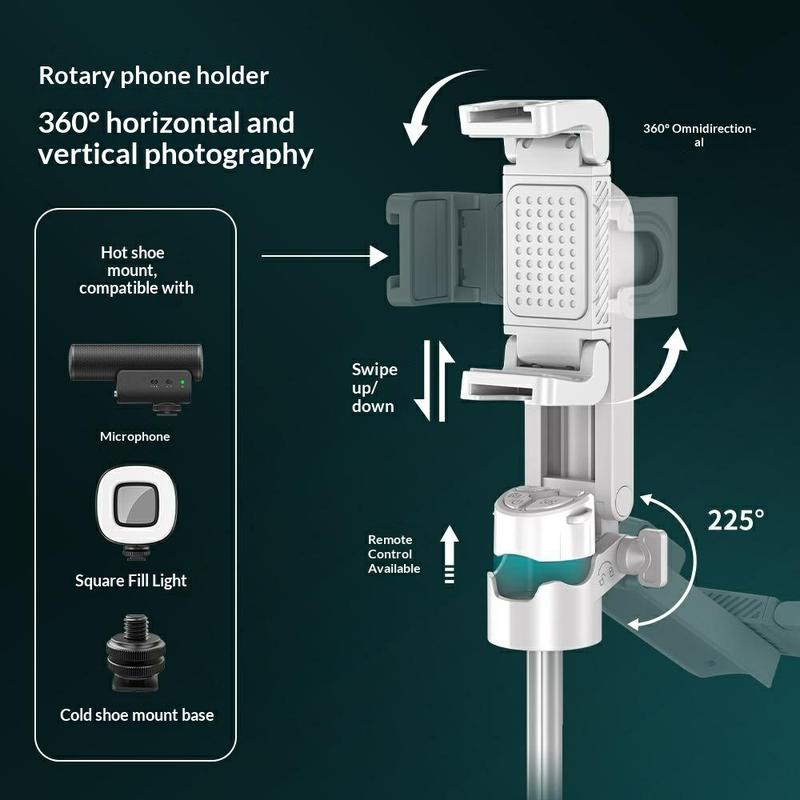 Het P15-Y mini selfie stick statief combineert een selfie stick, stabiel statief, draadloze afstandsbediening en compacte vullamp in één lichtgewicht accessoire. Ontworpen voor mobiele makers en biedt flexibiliteit en gemak voor fotografie, video-opname en live streaming.