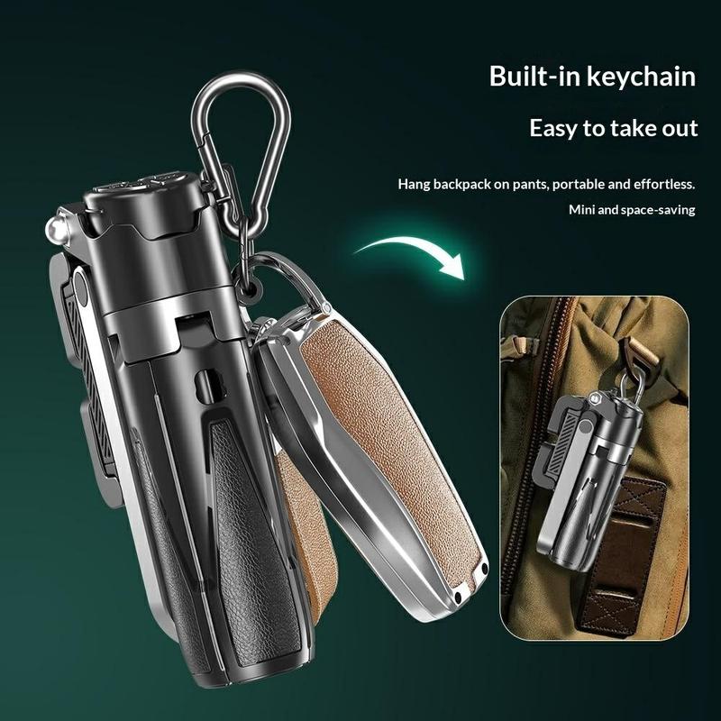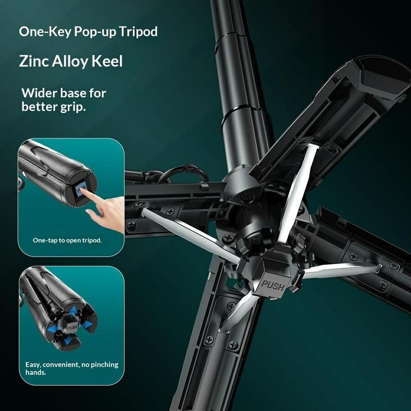 Het vierpotige statief met aluminiumlegering biedt betrouwbare stabiliteit op vlakke oppervlakken. Een one-touch pop-up mechanisme zorgt voor een snelle setup, waardoor het gemakkelijk is om te schakelen tussen handheld en desktop gebruik.
