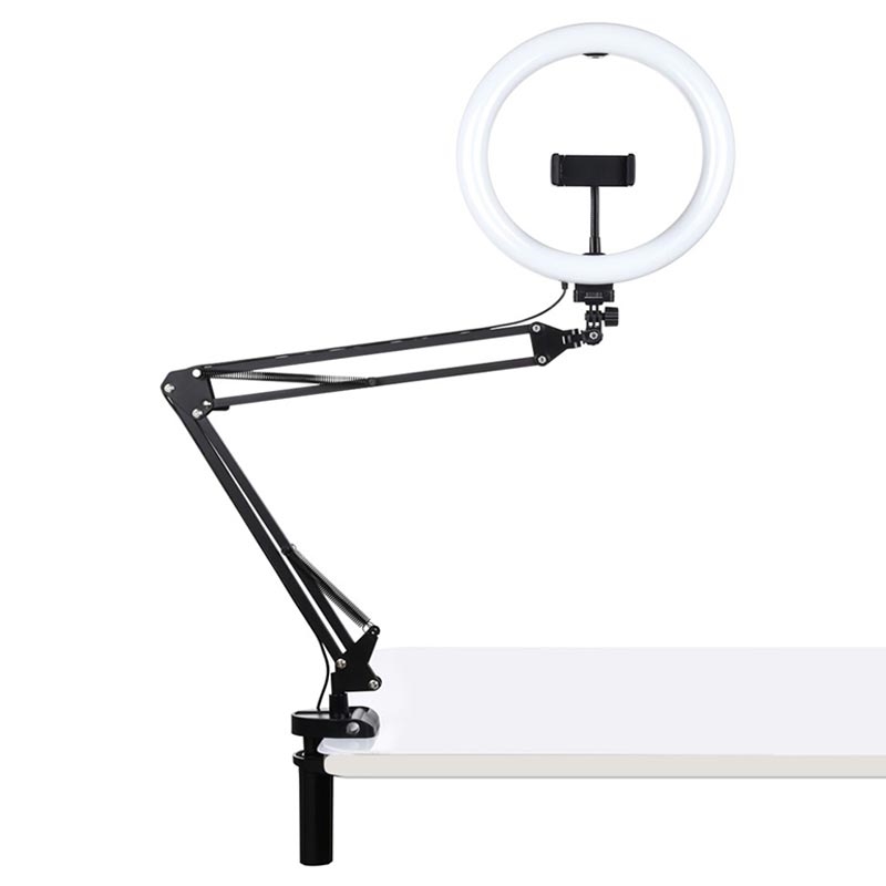 PULUZ 10.2" 26cm Ring Gebogen Licht + Desktop Arm Stand USB 3 Modes Dimbare Dual Kleurtemperatuur LED Vlogging Selfie Fotografie Videolampen met Telefoonklem