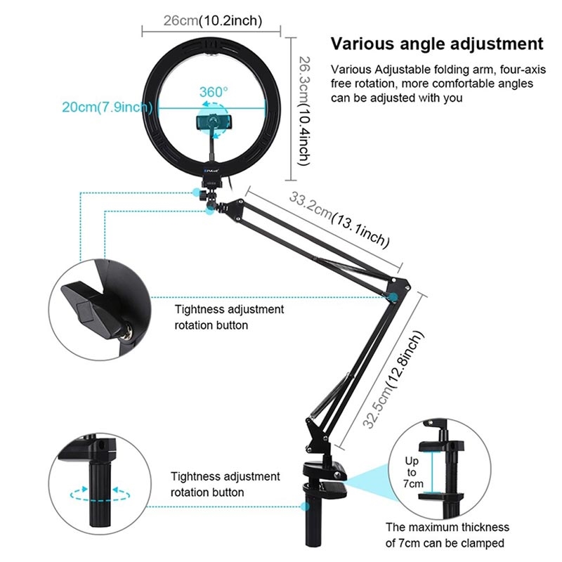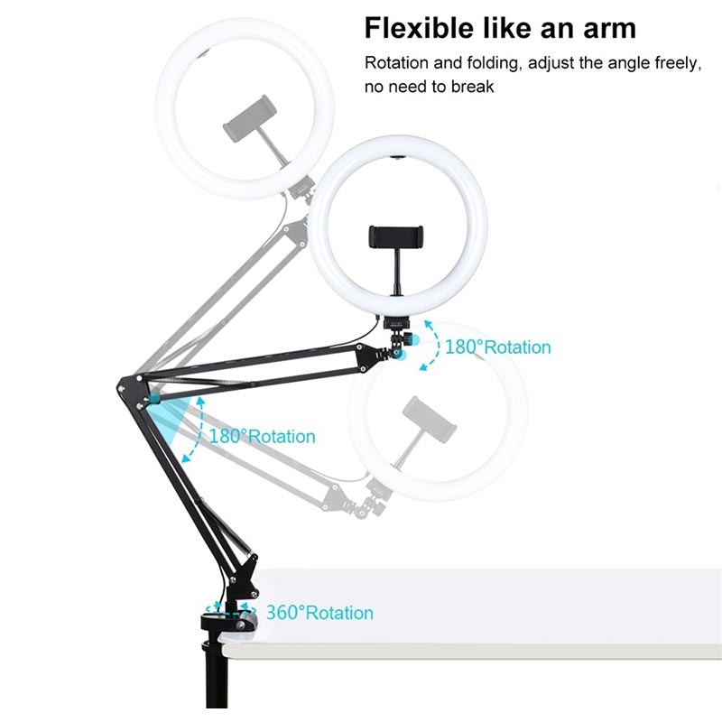 LED ring licht kan worden gemonteerd op de houder en neem het overal, het kan ook worden verwijderd uit de standaard op elk gewenst moment, het statief balhoofd kan 360 graden draaien kan vrij aan te passen aan elke hoek (De houder is niet inbegrepen)