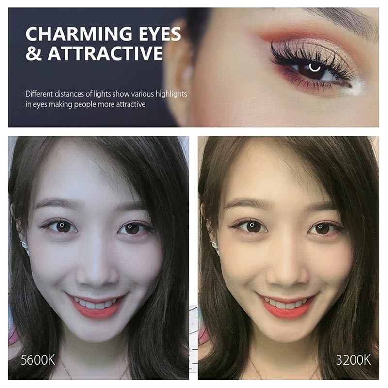 3 kleuren verlichting modus instelbare helderheid voor uw keuze, kunt u de kleur en helderheid heel gemakkelijk, goede helderheid kan worden bereikt zonder het installeren van extra kleurrijke filters. Drie kleuren zacht natuurlijk licht verlichten je schoonheid bij verschillende gelegenheden