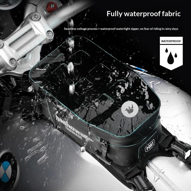 De tas heeft een volledig waterdicht ontwerp met waterdichte stof, een afgedichte constructie en waterdichte ritsen om je spullen te beschermen tijdens ritten in de regen. De voorgevormde structuur en het professionele bevestigingssysteem zorgen voor een stabiele pasvorm op de tank, waardoor beweging zelfs op ruwe wegen tot een minimum wordt beperkt. Met geïntegreerde reflecterende strips verbetert hij ook de zichtbaarheid van de motorrijder bij weinig licht voor extra veiligheid.