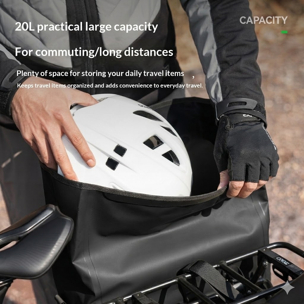 Neem je spullen tijdens elke fietstocht comfortabeler mee met de ROCKBROS AS-166 achterbagagetask. Deze veelzijdige fietstas van 20liter is ontworpen voor woon-werkverkeer, toertochten en dagelijks fietsgebruik en combineert praktische opbergruimte met betrouwbare bescherming tegen weersinvloeden. Dankzij de rolsluiting kun je de grootte van de tas aanpassen aan je lading, waardoor hij net zo handig is voor dagelijkse boodschappen als voor langere weekendritten.