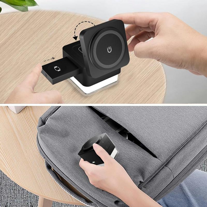 Dankzij de magnetische uitlijning blijven compatibele apparaten in de juiste positie voor stabiel opladen, terwijl het opvouwbare ontwerp ervoor zorgt dat het dock gemakkelijk in een tas of rugzak past. Het beschikt ook over RGB-sfeerverlichting die een zachte decoratieve gloed toevoegt en kan dienen als zacht nachtlampje op een bureau of nachtkastje.