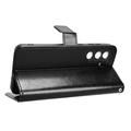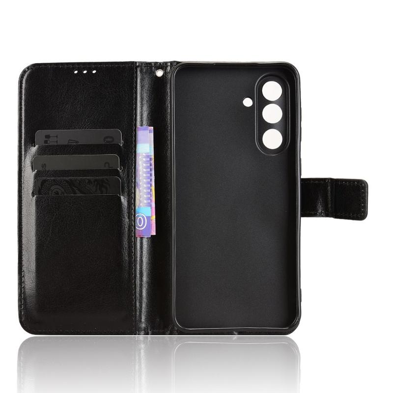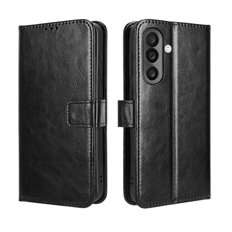 Geef je nieuwe Samsung Galaxy M56 een verfijnde, vintage look en vervang je alledaagse portemonnee. De buitenkant van polyurethaan met Crazy Horse-textuur wordt gecombineerd met een schokabsorberend TPU-omhulsel dat bescherming biedt tegen vallen en krassen, terwijl slimme vakjes pasjes en geld op orde houden.