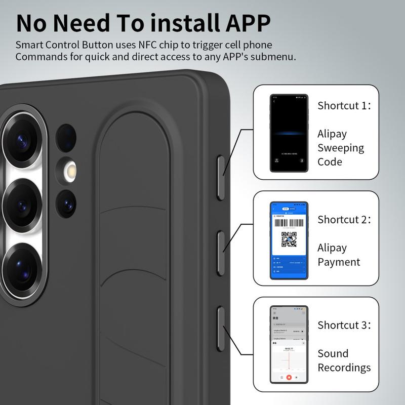 Deze slimme hybride hoes is uitgerust met drie intelligente NFC-knoppen waarmee je met één druk op de knop snel toegang krijgt tot apps als Camera, Zaklamp of Screenshot. Niet opladen, geen extra apps - gewoon eenvoudige, directe functionaliteit.