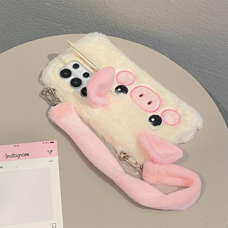 • Pluche varkentje hoesje met kickstand en handband voor Samsung Galaxy S24 Ultra